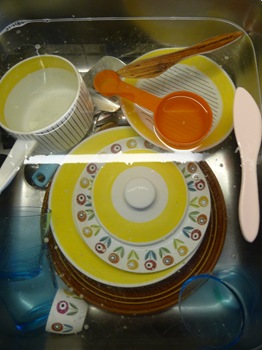 I morse var det kul att diska. Grill Gul är en av mina porslinsfavoriter. Dekoren ritades av Bibbi Breger 1958 för Gustavsberg. Jag gillar kombinationen av de tunna svarta och de breda gula ränderna. Den finns i brunt och grönt också, men gult är min favorit. Idag till frukost fick den sällskap av assiett och äggkopp från Karlskrona porslinsfabrik med dekoren Bellis av Eva Bladh Ståhl. I botten skymtar Gustavsbergs Rustik av Britt-Louise Sundell. Den är en riktigt bra vardagsservis. Fast å andra sidan kan man använda allt till vardags. När ska man annars använda det?