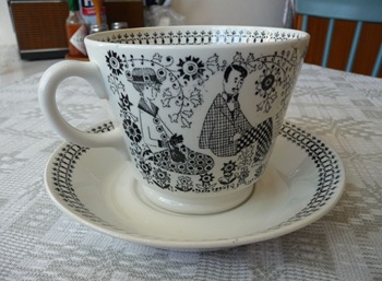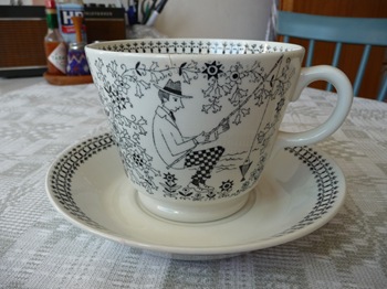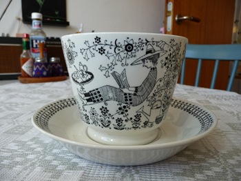 Den här tekoppen hittade jag på auktion för ganska många år sedan nu. Dekoren heter Emilia och är gjord av Raija Uosikkinen för Arabia. I serien finns en hel massa delar, bland annat en fantastiskt kvadratisk porslinsbricka.